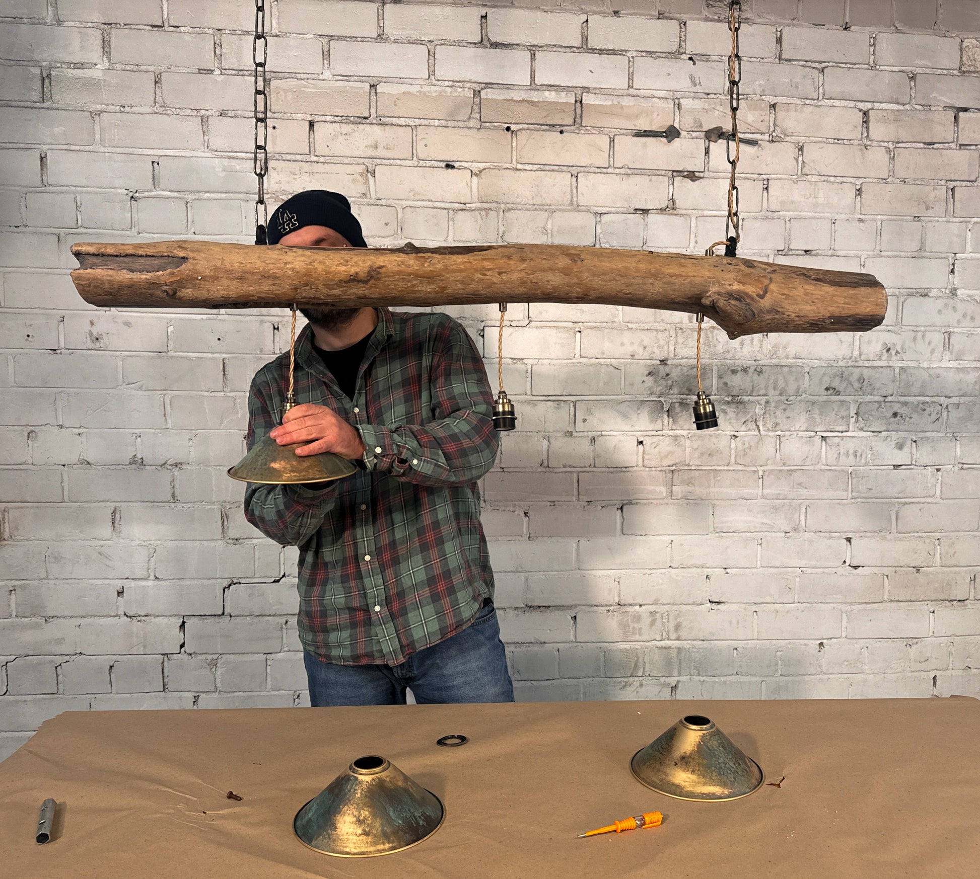 Crafted from timeworn driftwood and aged brass shades with a natural patina, Rustic Shoreline embodies the quiet poetry of weather and time. Each piece is entirely handmade — no two are alike.