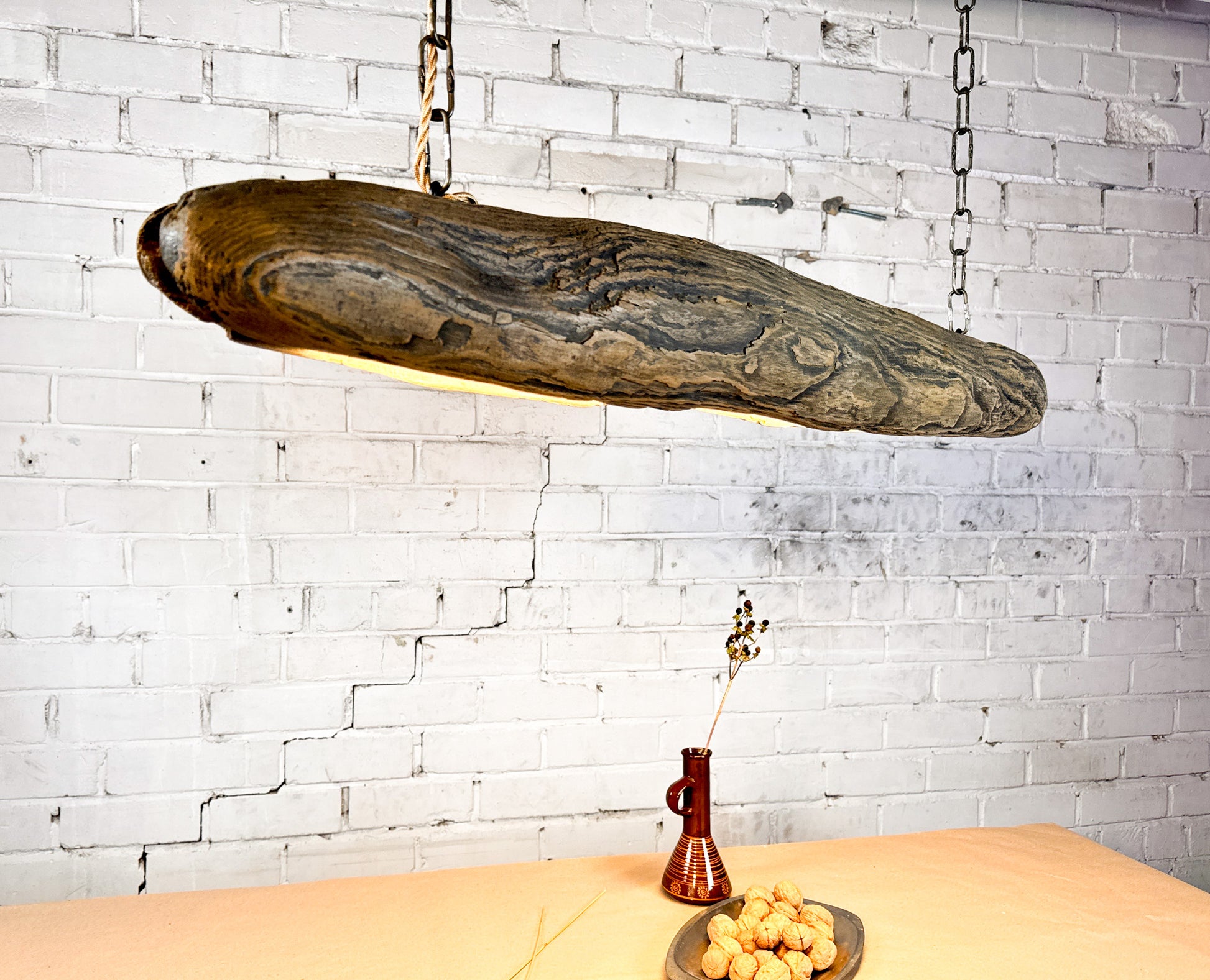 Suspended by aged iron chains, the beam appears weightless — strong yet serene. Perfect above a dining table, kitchen island, or open living space, Siled Drift fills the room with a sense of calm authenticity.